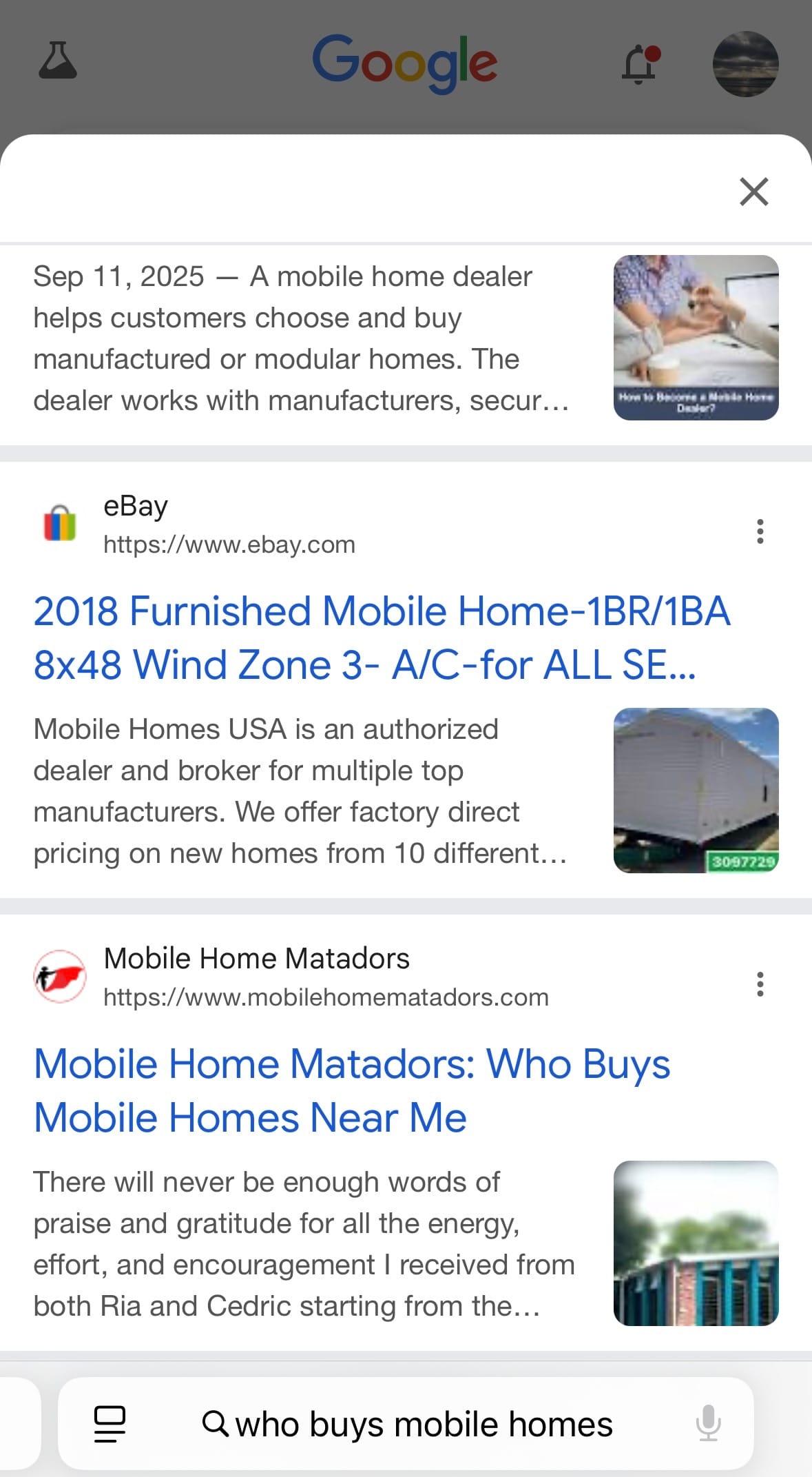 📸 [Google AI Overview showing Mobile Home Matadors indexed and cited]