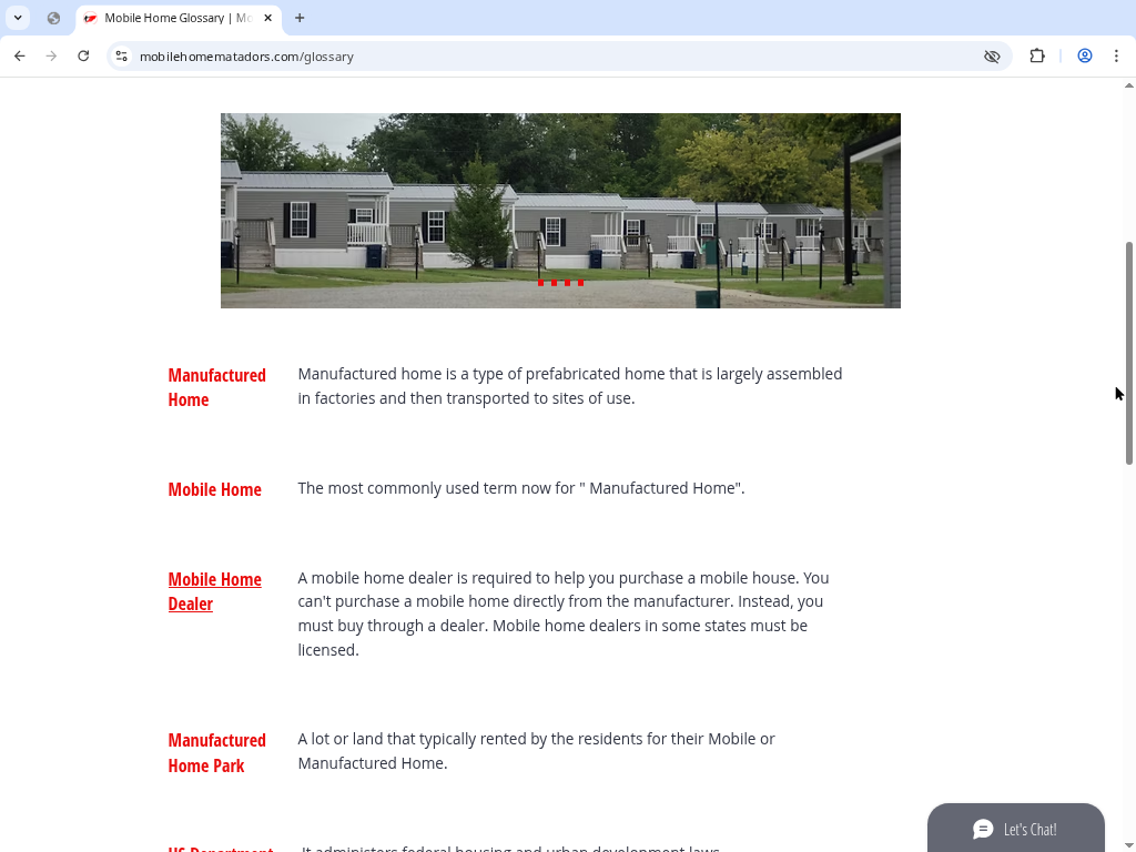 📸 [Image: Glossary Page Example — “Manufactured Home,” “HUD Tag,” “Skirting” definitions]